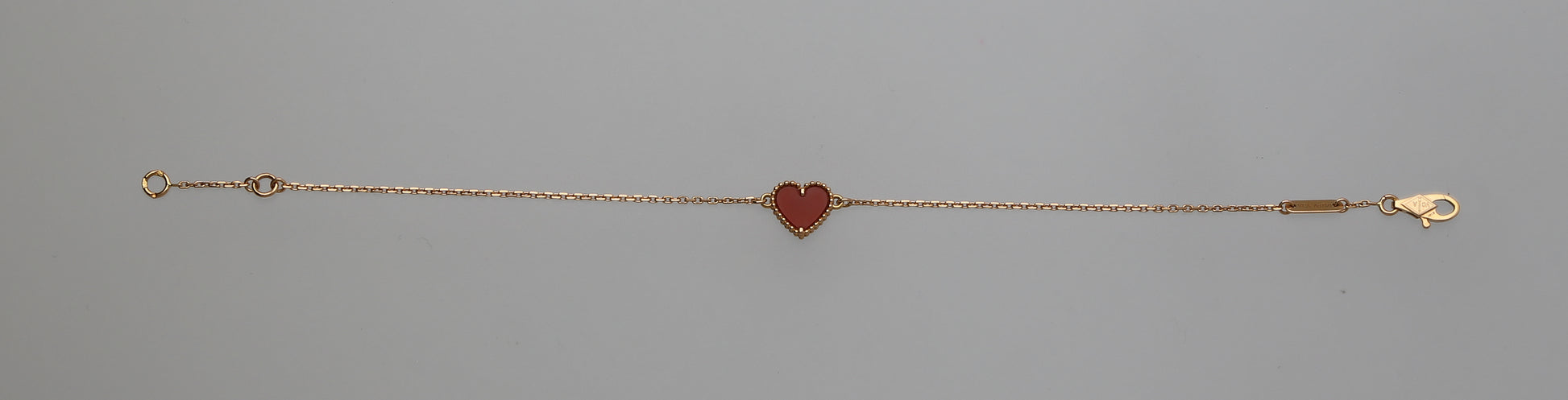 Bezauberndes Armband aus der "Sweet Hearts" Kollektion in Roségold 18K mit einem Herz aus Karneol. Länge 18 cm mit Zwischenöse bei 16 cm, 1,7 g. Mit VCA Box.