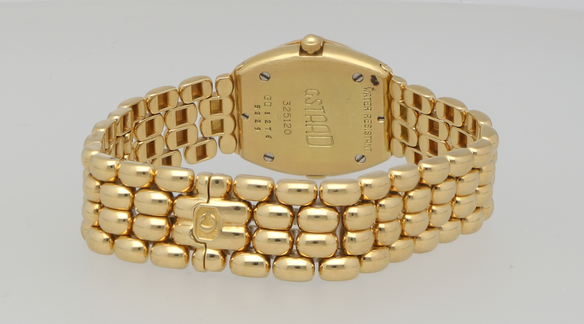 Chopard Gstaad, Gelbgold 18K, Referenz 5229, Durchmesser 23,8 mm mit Saphirglas, Gehäuse Zifferblatt weiss mit 11 Diamanten, Datum und Sekundenanzeige, Werk Quarz, Gewicht 87 g, Band Goldband mit Butterfly-Verschluss, Armumfang 16 cm, Zustand: Gut.