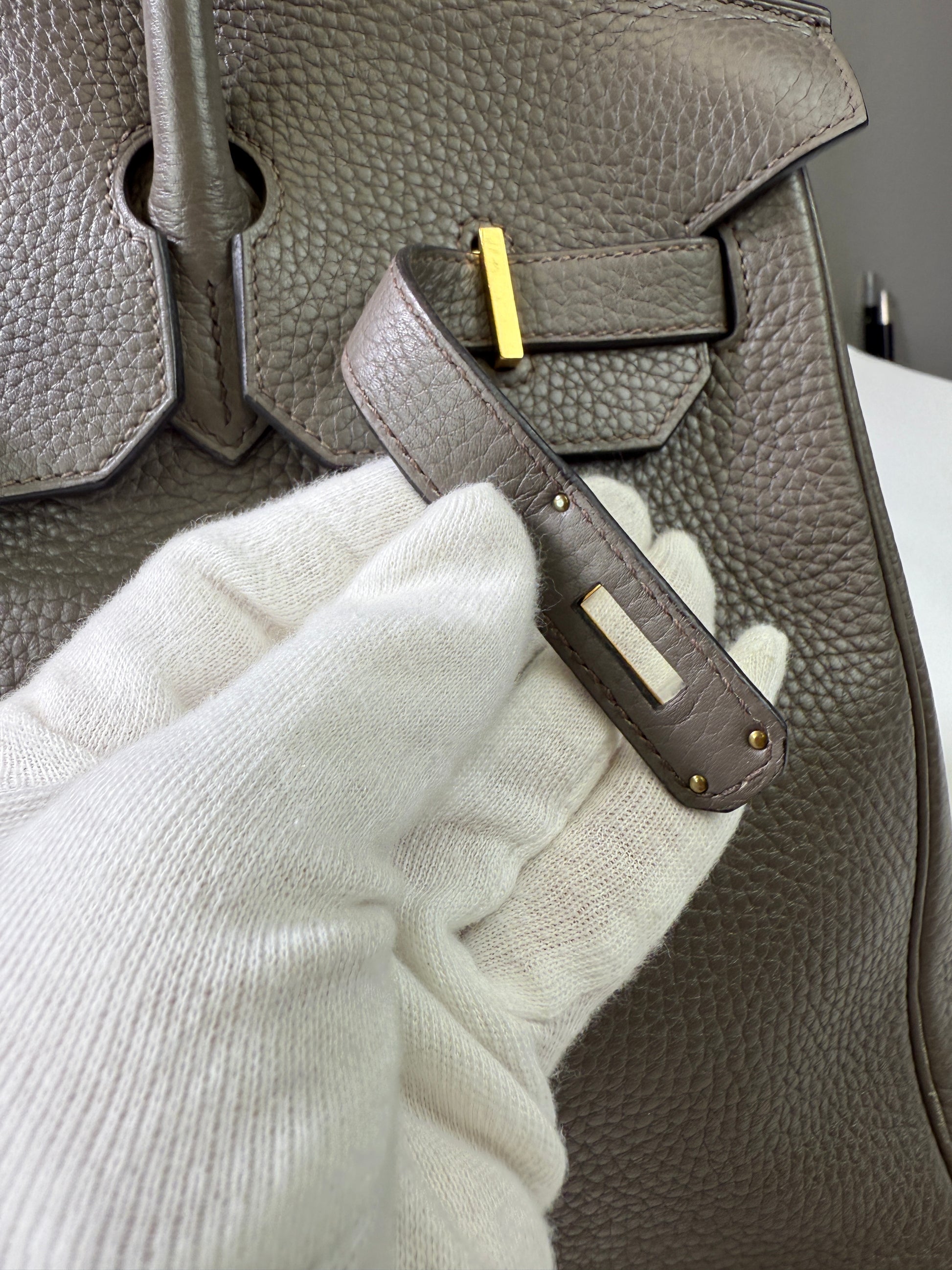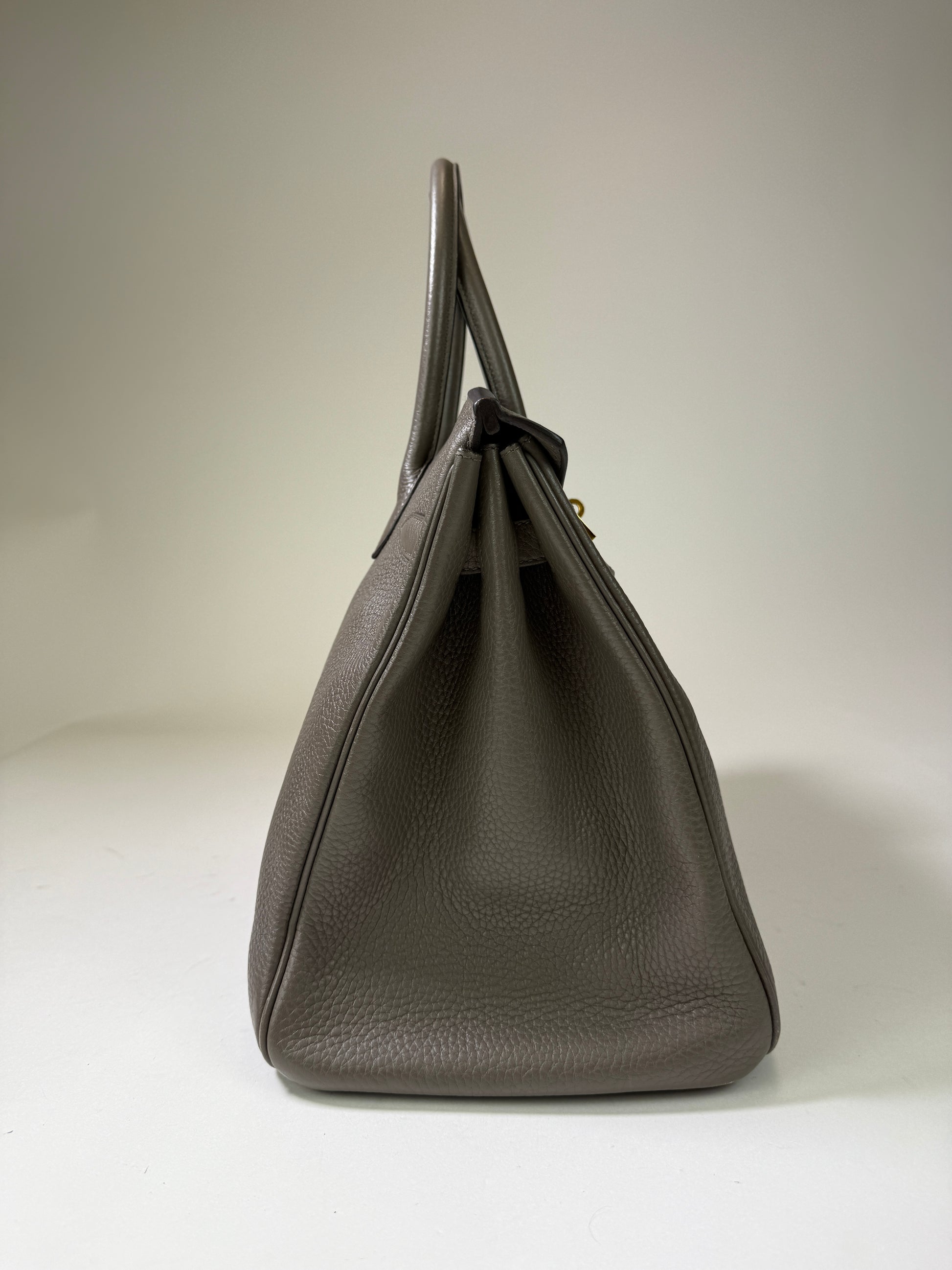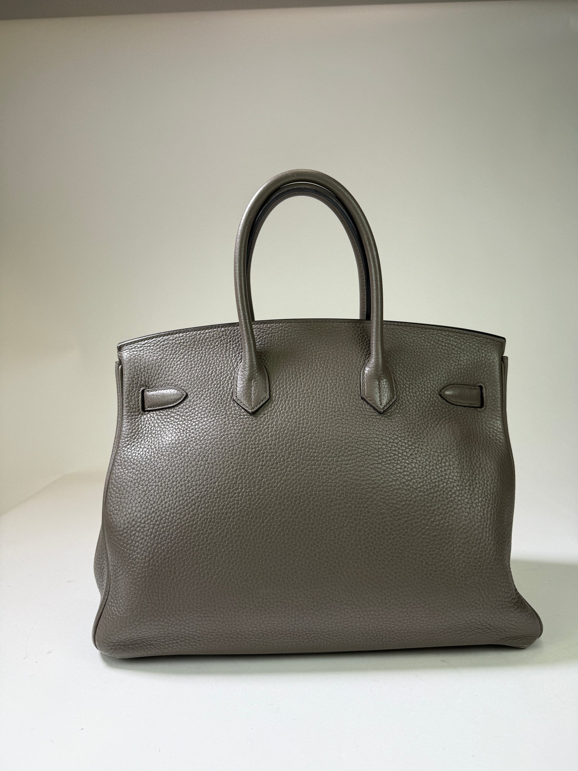 Klassische Hermès Birkin 35 in der begehrten Farbe Etain, gefertigt aus fein genarbtem Togo-Leder. Das Modell zählt zu den ikonischsten Entwürfen des Hauses Hermès und steht exemplarisch für höchste Handwerkskunst und zeitlose Eleganz.