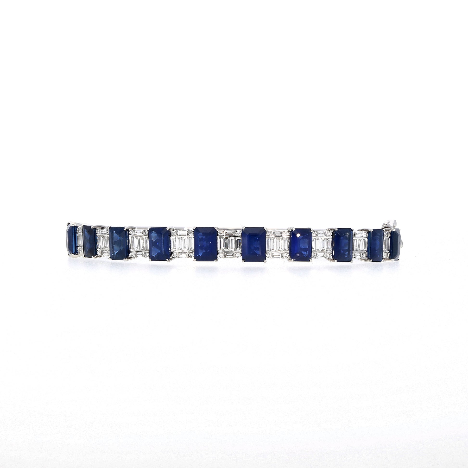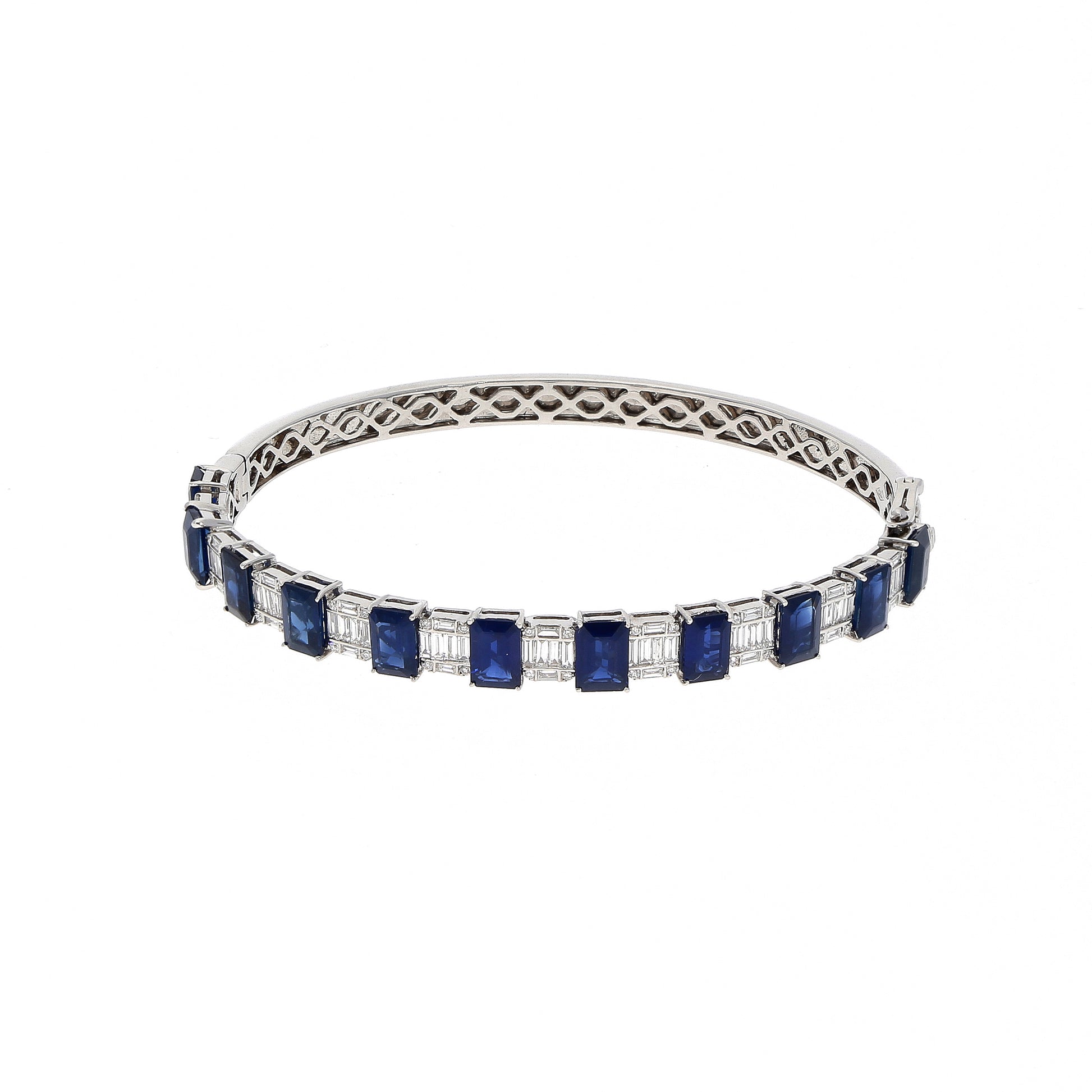 Aparte Armspange in Weissgold 18K, ausgefasst mit schönen Saphiren von zus. ca. 7,09 ct sowie Diamanten im Baguetteschliff und im Brillantschliff von zus. ca. 1,13 ct (G/VS), Armumfang 17 cm, 16,3 g.