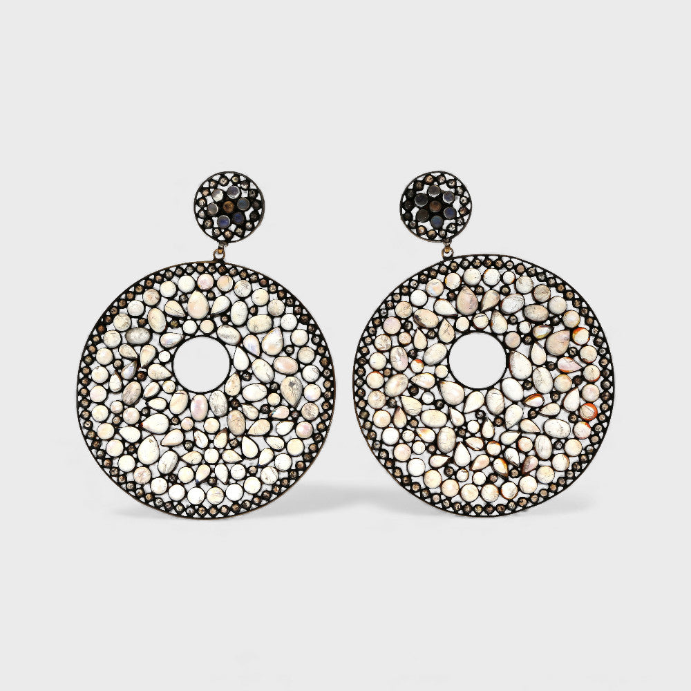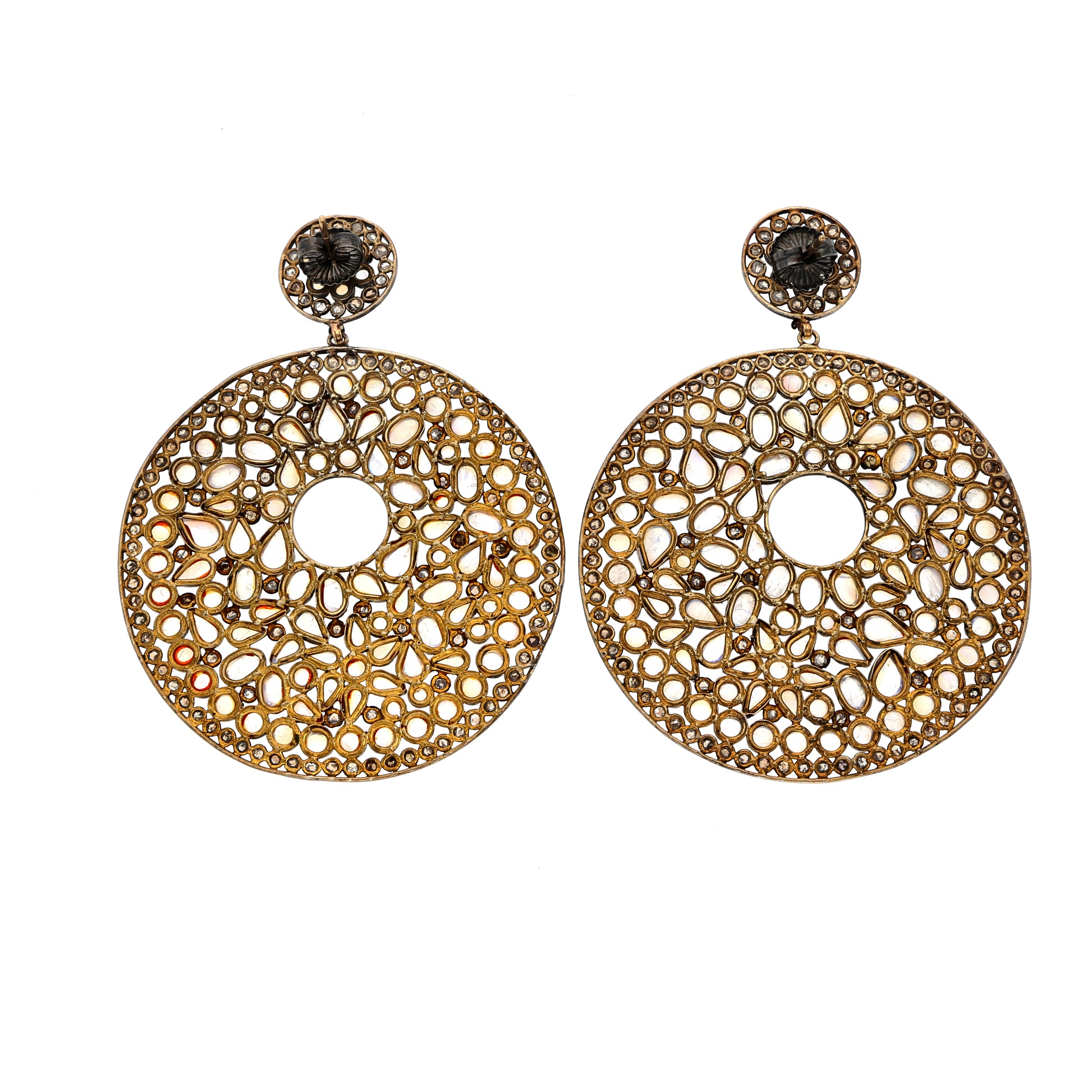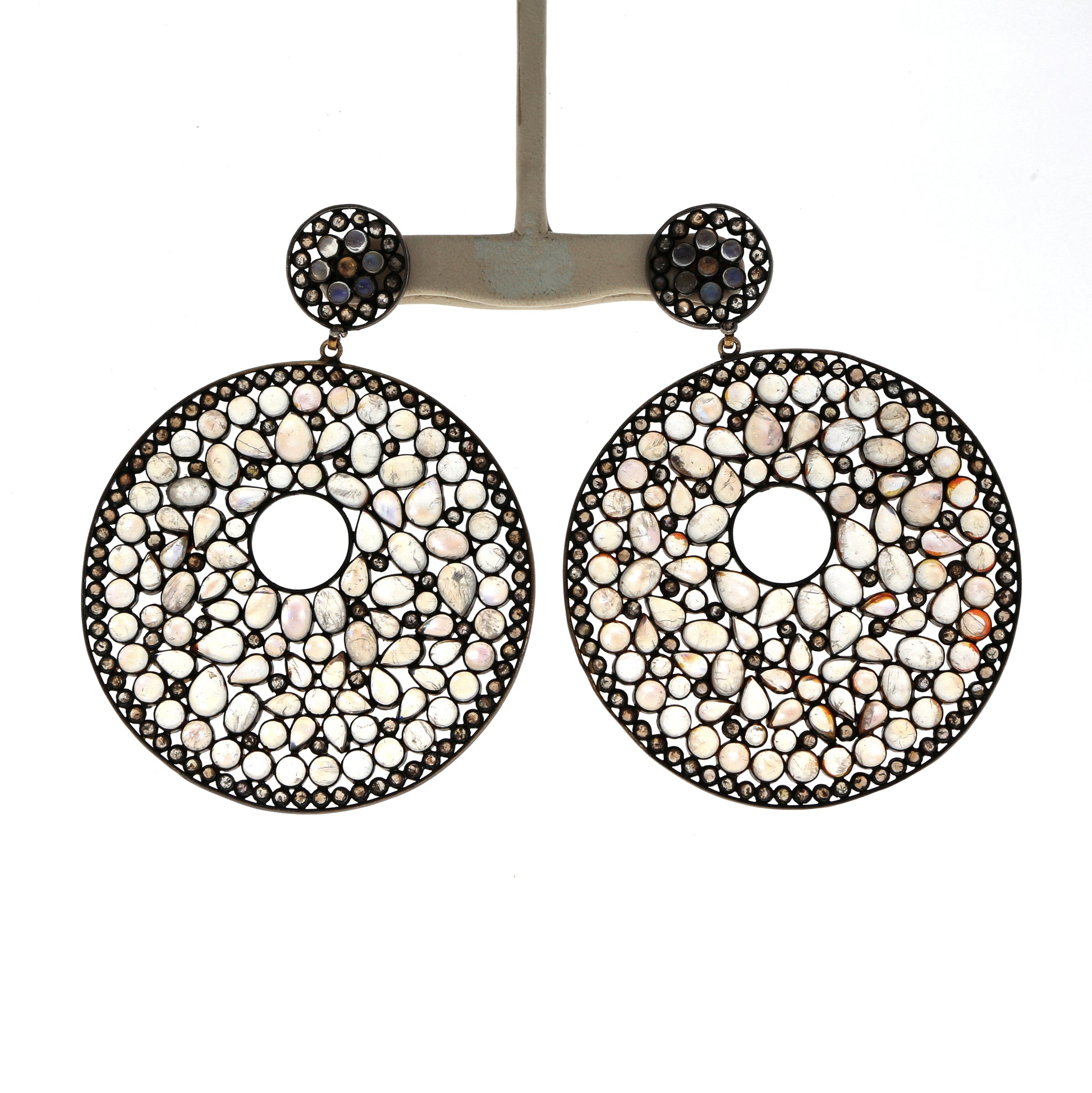Kunstvolle Ohrhänger in Silber, die Oberfläche ist vollständig mit zahlreichen, kleinen, unregelmässig geformten Mondsteinen besetzt, die in dunklem Silber eingefasst sind, in Kombination mit Rosenschliff-Diamanten, Länge: 8 cm, Breite: 6 cm, 42,3 g.