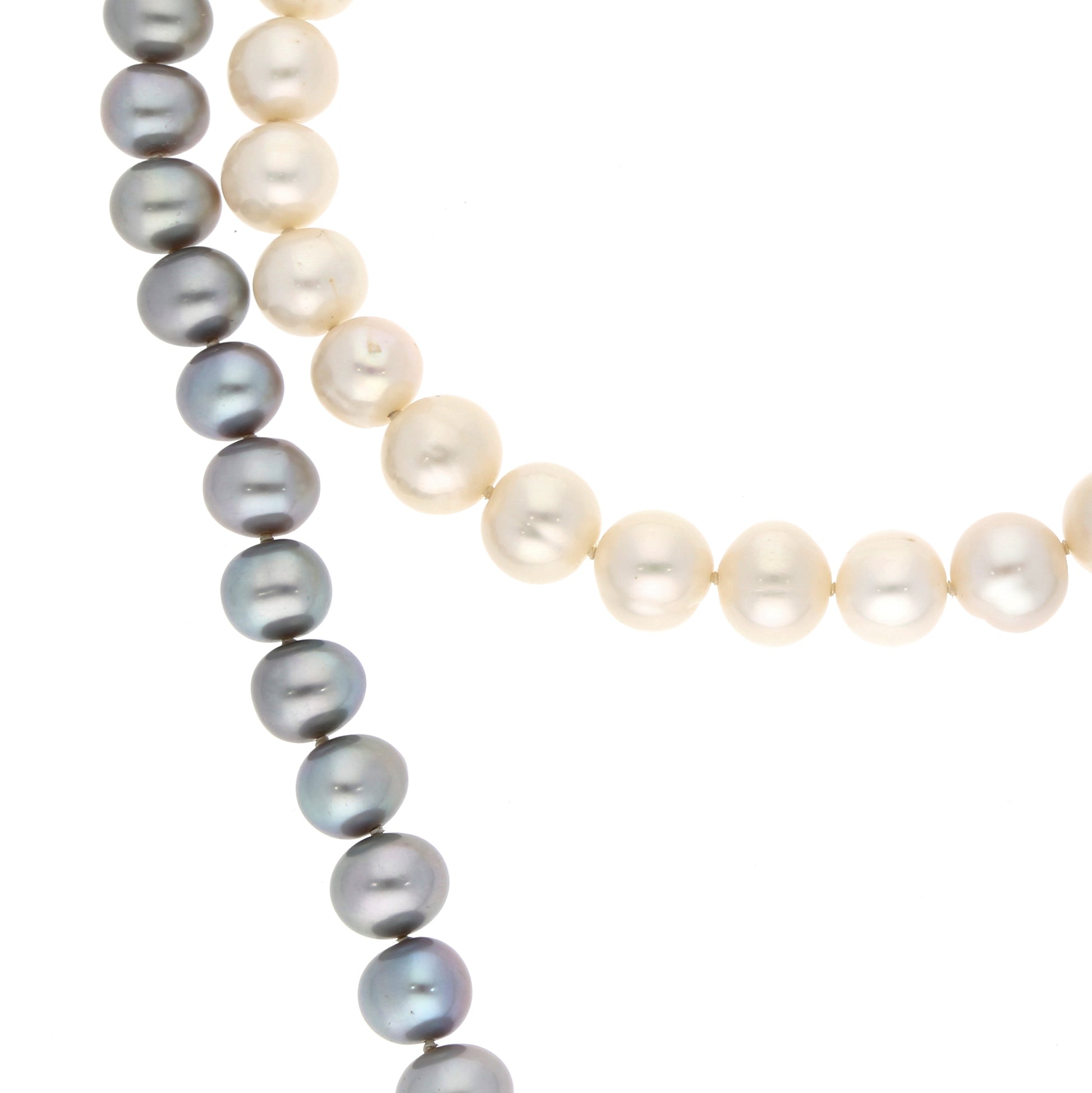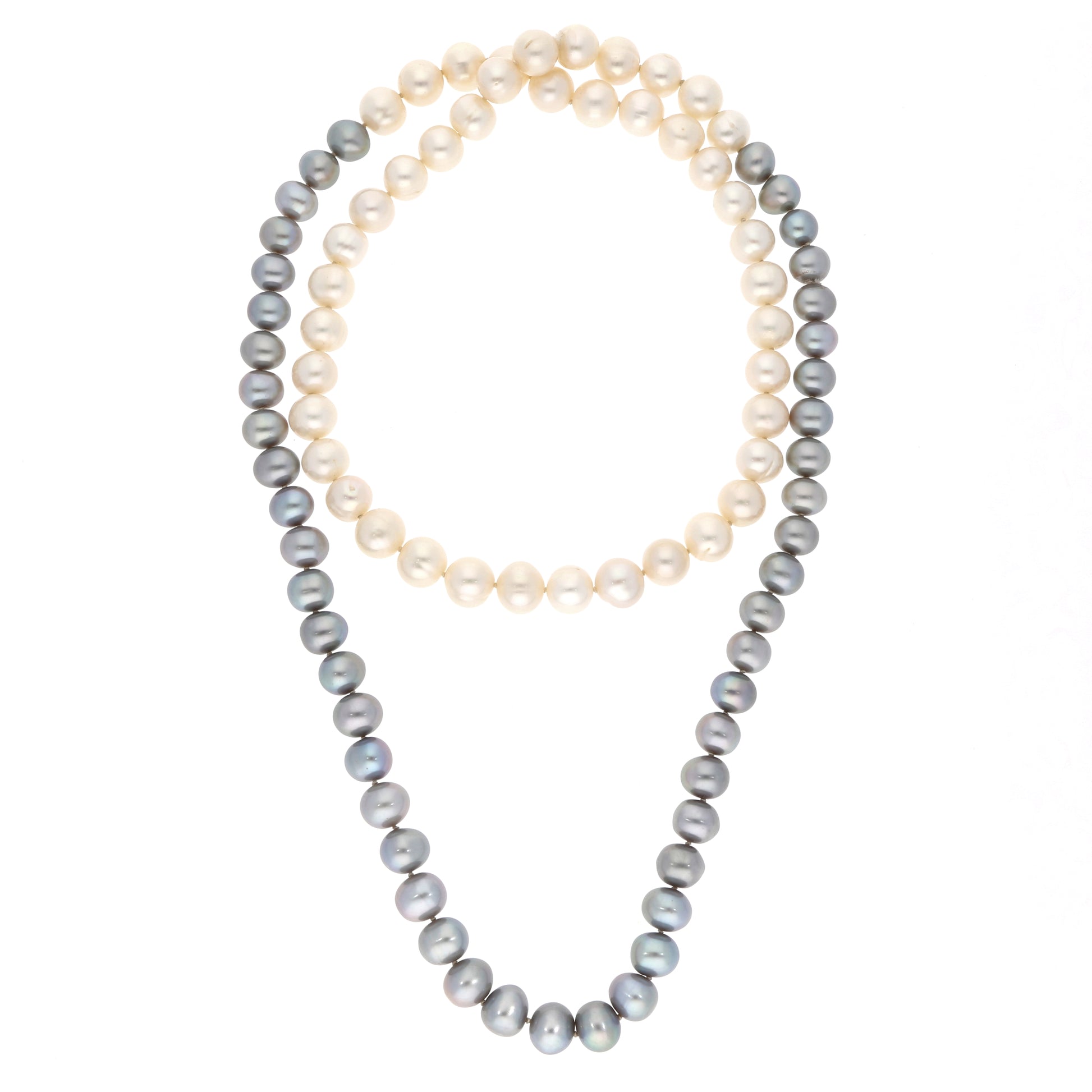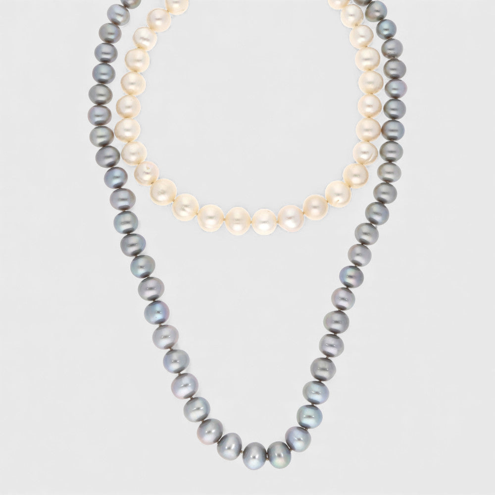 Zweifarbenes Südseeperlen-Sautoir mit weissen und grauen Perlen in unregelmässiger Form, Durchmesser ca. 9,4-10 mm, ohne Verschluss, Länge: ca. 80 cm.