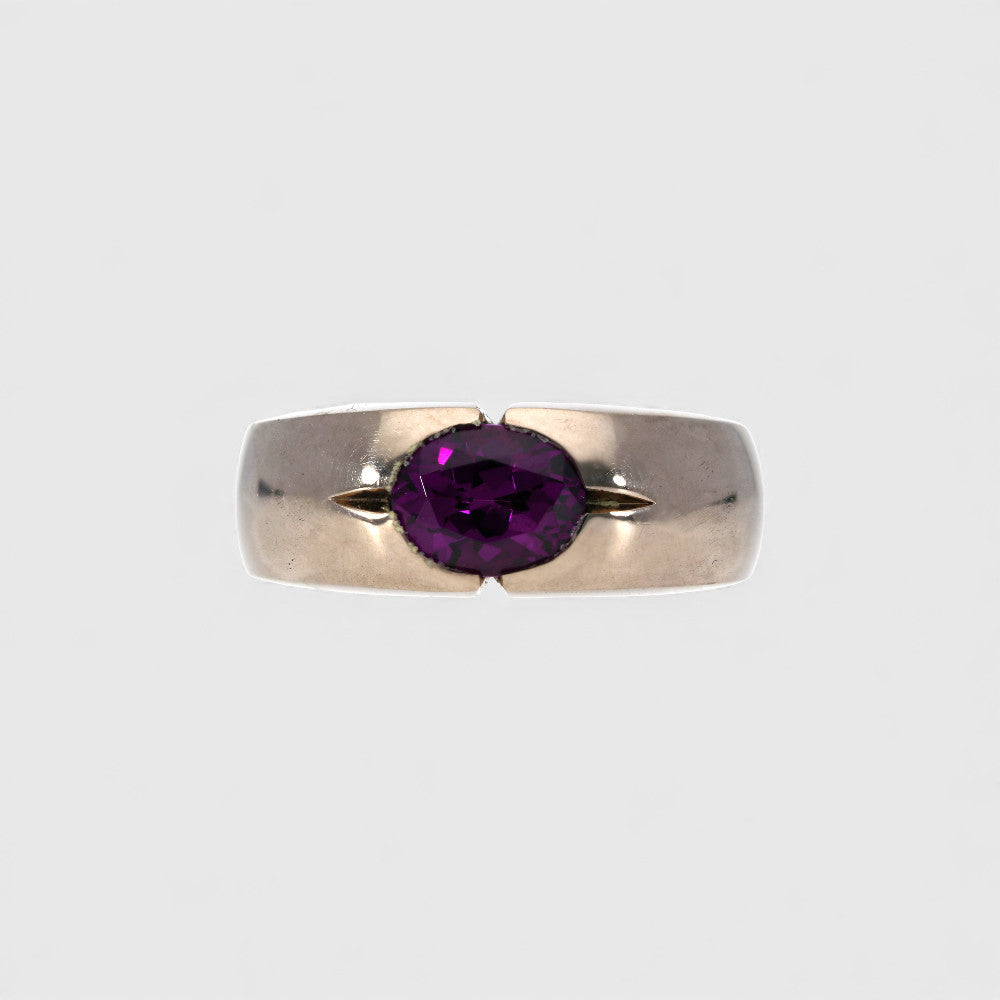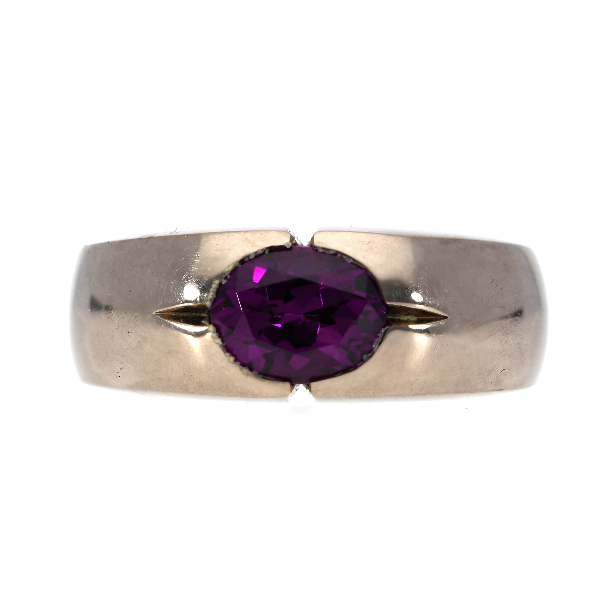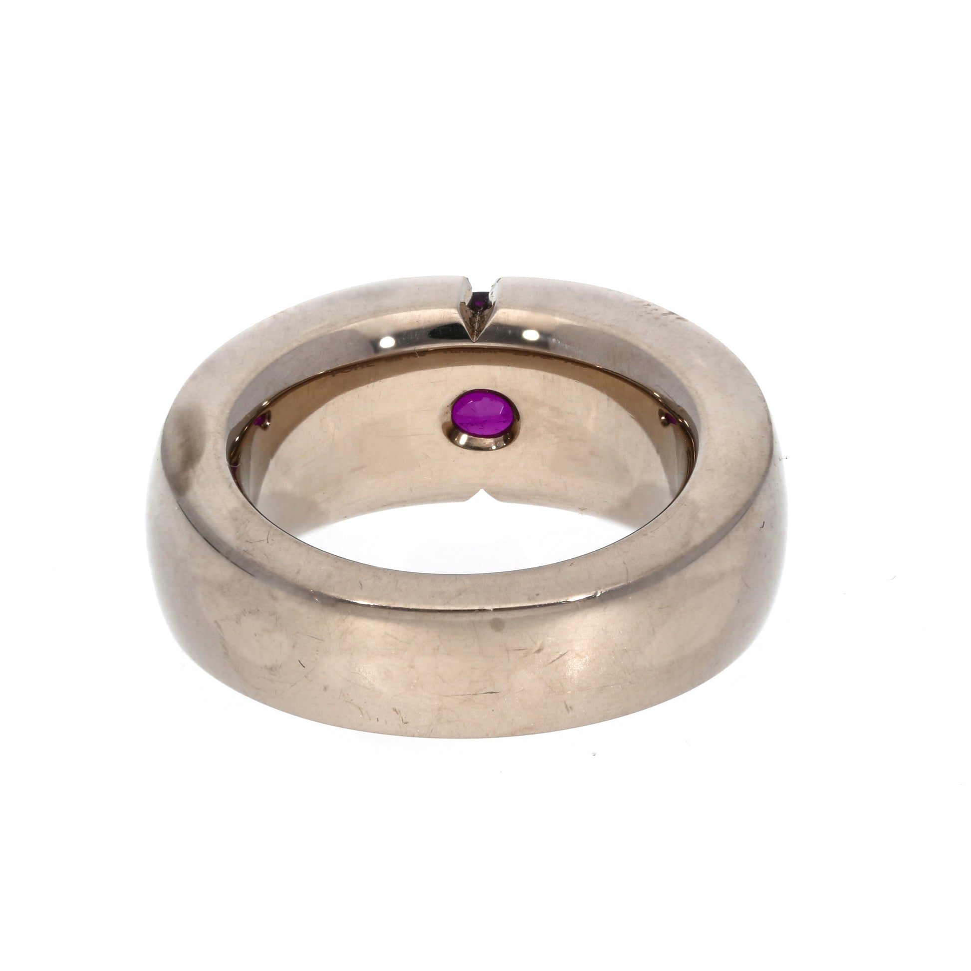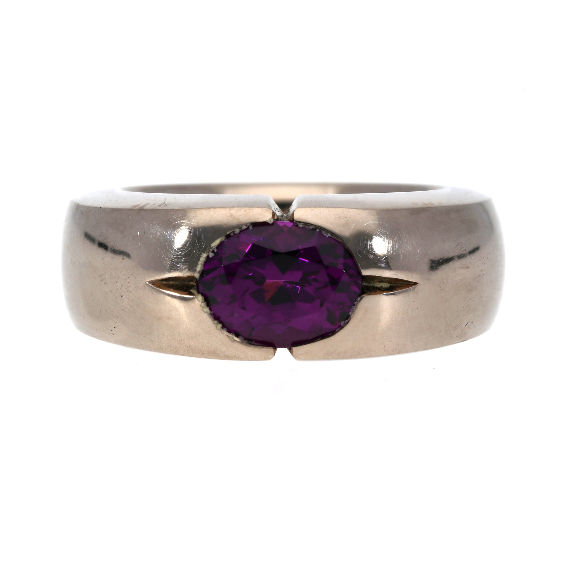 Moderner, massiver Designer Ring, signiert Jochen Pohl, in Weissgold 18K mit einem seltenen, violetten Turmalin von ca. 2,01 ct in spezieller, dekorativen Fassung und polierter Ringschiene, Ringgrösse 54, 31,2 g.